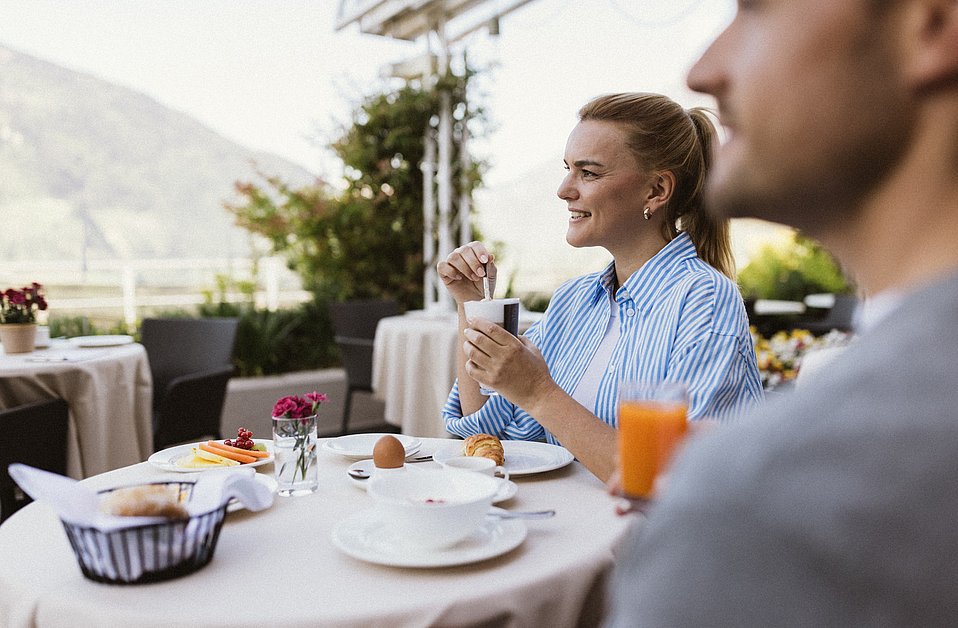 The enticing scent of tea and coffee awakens your spirits in the morning. And if the weather is good, you can enjoy the almost magical view of Merano from our panoramic terrace already for breakfast. Savour fresh bread, specialities of South Tyrolean cold cuts and cheese, farm-fresh fruit and vegetables, traditional sweet dishes, various types of egg- based dishes, homemade spreads and fresh porridge.