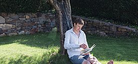 And Eve knows exactly what he means. For outside, at the garden of the Paradies, the eyes wander from the shimmering water of the heated swimming pool to the green lawn, the bushes and trees and up to the deep blue sky. A wonderful play of colours that provides relaxation and energy – whether you are enjoying a lazy day or recalling the impressions of the day after an adventurous hike here at the hotel with pool, Tirolo.